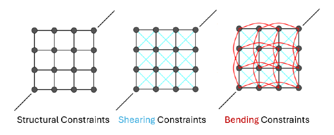 - Shearing constraints connect each point mass to its upper-left and upper-right diagonal neighbors.