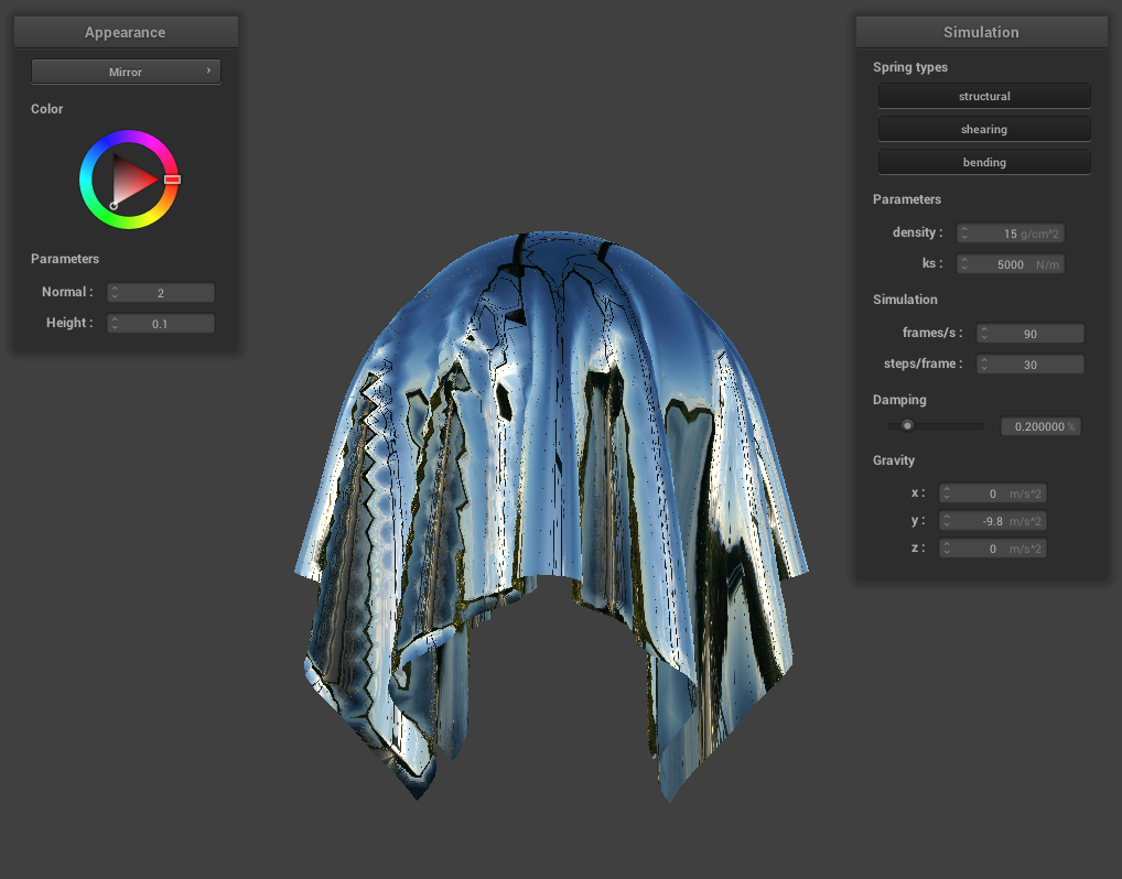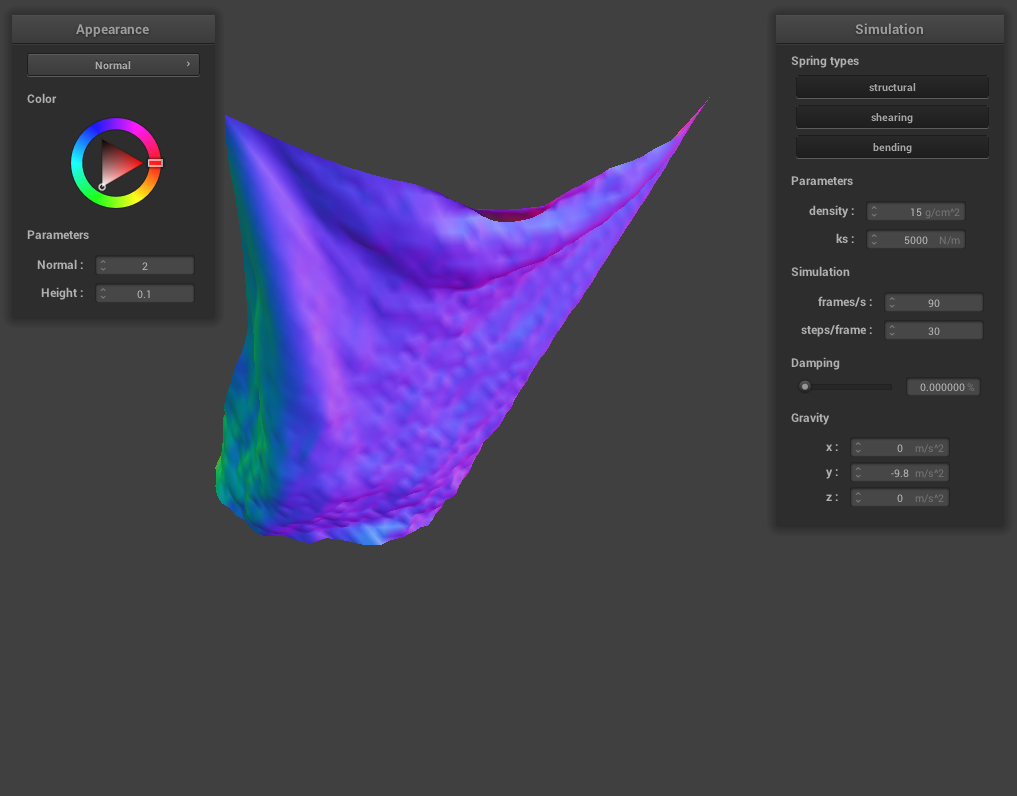 In this section, we experiment with different values of key simulation parameters, including the spring constant \(k_s\), point mass density, and damping factor \(d\). We analyze how each of these parameters affects the behavior of the simulated cloth.